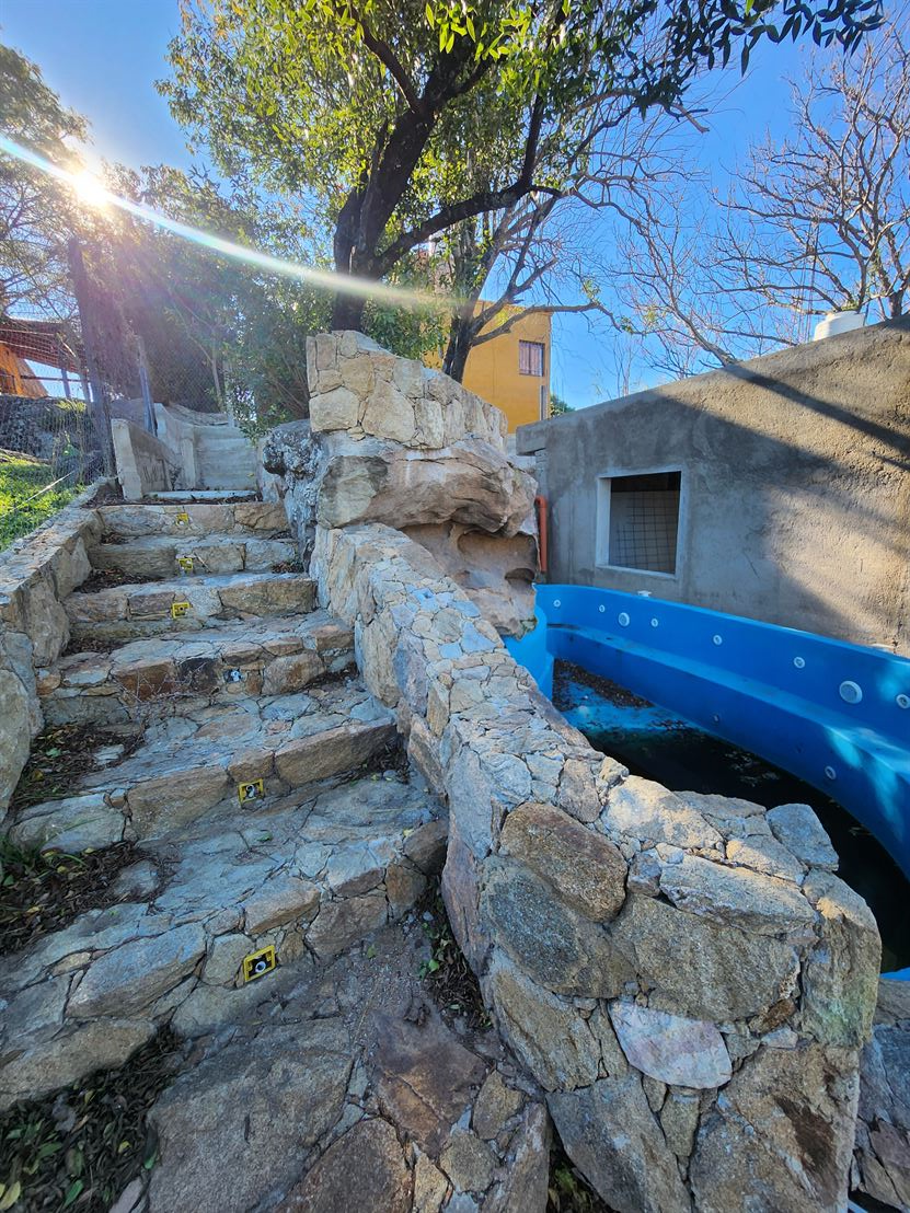- JUNTO A LA PISCINA, ESCALERA DE PIEDRA CON INSTALACIÓN PARA LUMINARIA EN LOS ESCALONES.